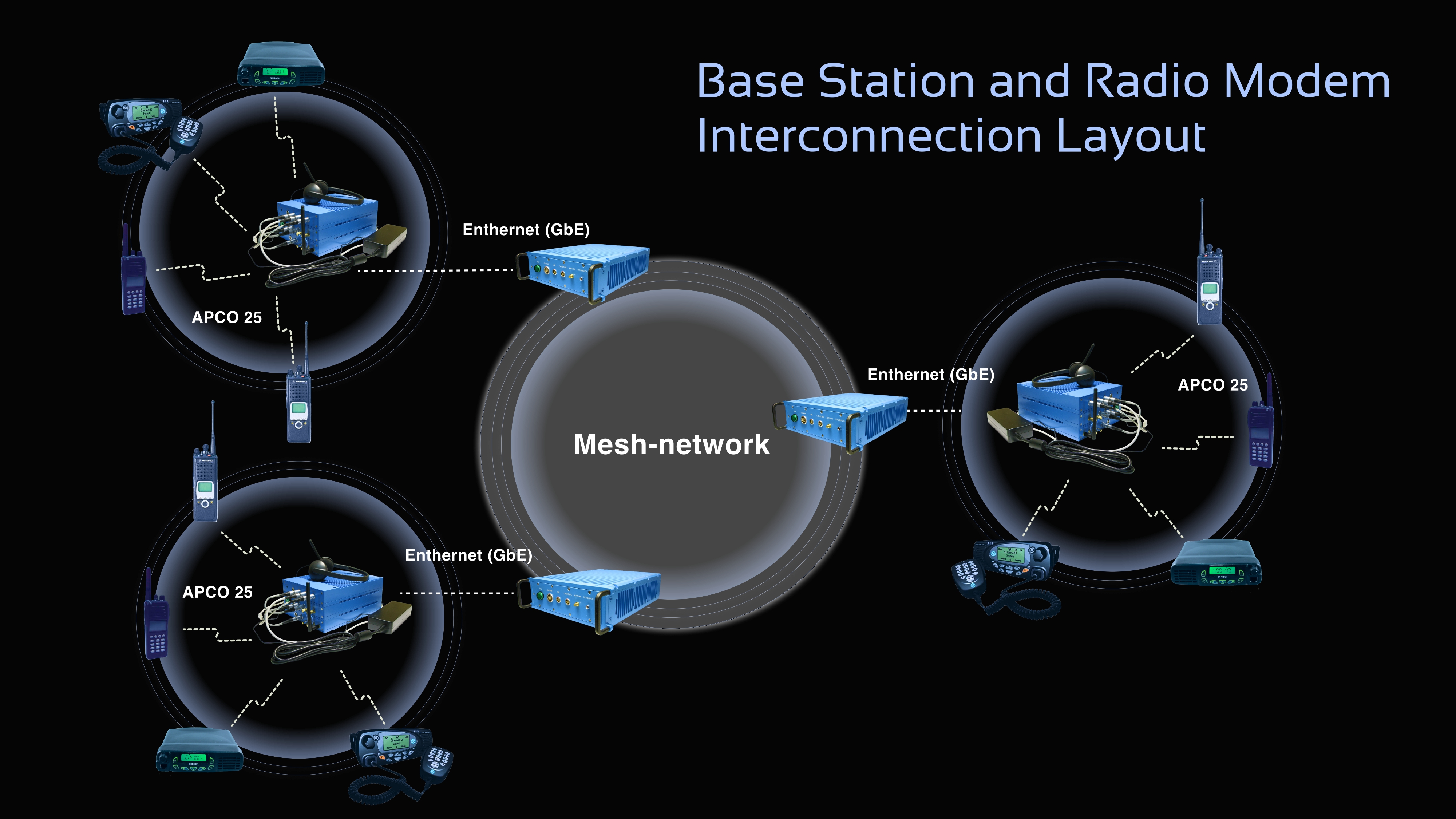 Wideband base station radio communication modem is used in peer-to-peer dynamic radio communication networking with self-healing structure like DM 1-band MESH networks. Radio modem in radio network can serve as a terminal device or a repeater. Radio modem transmits and receives data from the end user via a radio modem interface.